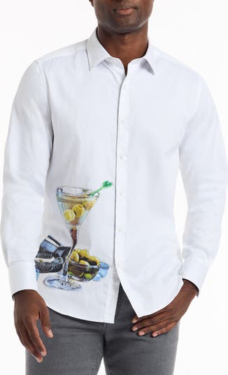 Sip in dapper style wearing this cotton button-up shirt featuring an embroidered martini graphic.
