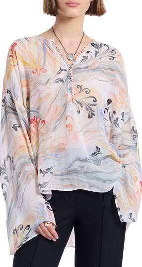 This top features long, drapey sleeves and a split neckline with a button‑and‑loop closure offering a lightweight, fluid feel with a soft, elegant drape.