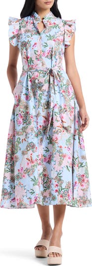 Stroll through sunny days in this floral cotton-poplin shirtdress framed by a ruffled collar, fluttery cap sleeves and a removable tie belt.