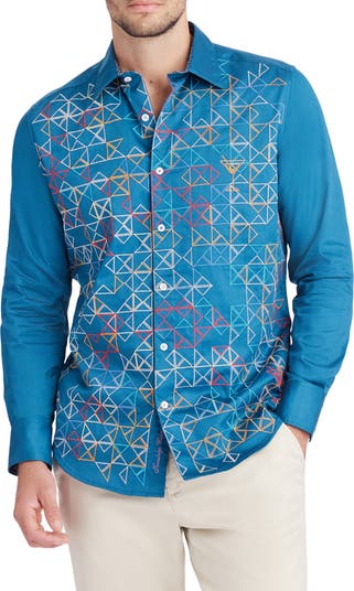 Geometric embroidery boosts the modern style of this slim-fit button-up shirt cut from pure cotton for breathable comfort throughout your day. Contrast trim at the cuffs and collar add a bold pop of style to your look.