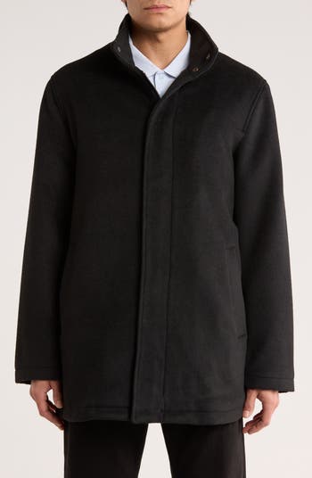 A covered placket and clean-lined silhouette emphasize the timeless minimalism of this water- and wrinkle-resistant coat kissed with warm wool fibers.