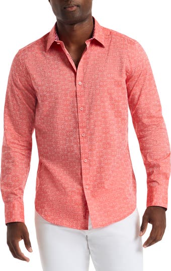 Stay cool and comfortable in this abstract-patterned button-up shirt cut from cotton with cuffed sleeves and a collar that show off a hidden geometric print.
