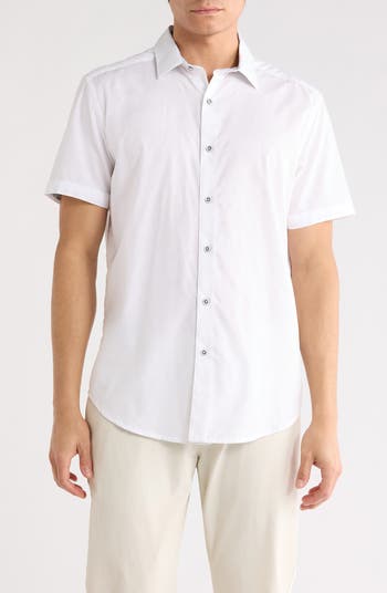 Stretch-enhanced cotton keeps you feeling comfortable and looking polished in a button-up shirt rendered in a neutral hue for easy pairing on casual or elevated outings.