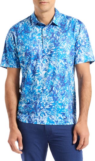 Bold abstract print adds statement-making style to this soft knit polo enhanced with comfortable stretch.