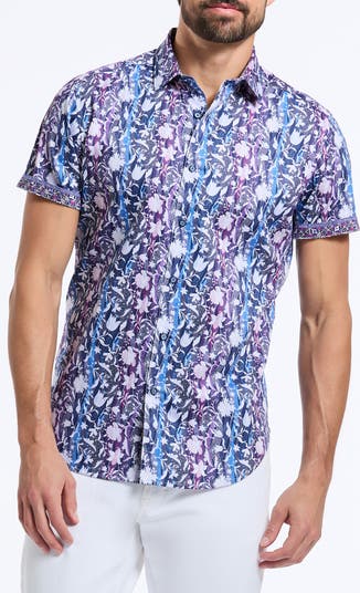 You'll look sharp in a snap in this boldly printed short-sleeve button-up shirt cut from pure cotton.