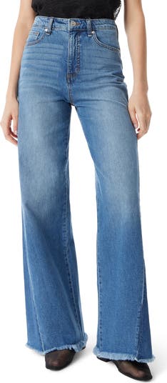 Frayed edges and signature fading at the thighs lend lived-in charm to light-wash jeans cut with full-length wide legs to keep your daily looks trendy and chic.