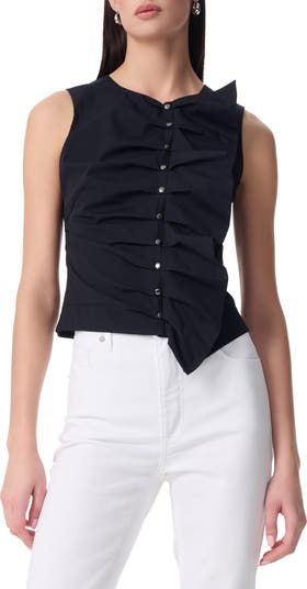 Make a sophisticated statement in this smartly tailored V-neck vest that buttons up the front and pulls to one side with a powerfully pleated ruffle.