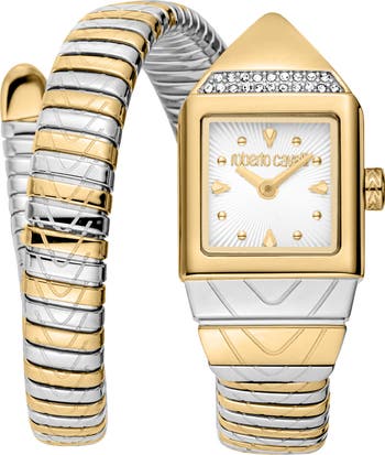 A geometric case heads this snake-inspired watch completed by a slinky wraparound bracelet, creating a captivating silhouette on your wrist.