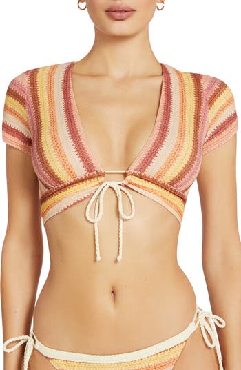 A crochet-inspired knit pattern is sure to keep you feeling at home by the water in this cap-sleeve bikini top.