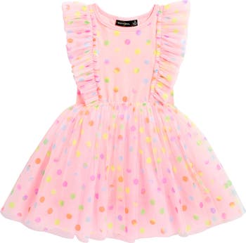 They'll love this precious party dress with layers of frilly ruffles, frothy tulle and ombré polka dots that pattern the dramatic fit-and-flare silhouette made for endless spinning.