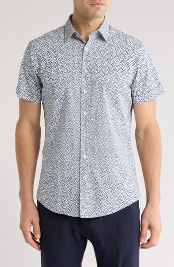 A ditsy pattern brings cool appeal to a short-sleeve button-up shirt cut from crisp cotton.