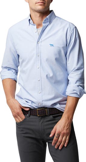 Solid coloring brings easy versatility to a wardrobe-staple cotton sport shirt finished with a button-down collar to keep the look classic.