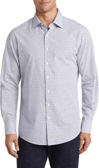 Finely scaled motifs keep the allover pattern from overwhelming your look in this button-up classic cut for an easy, comfortable fit from smooth, crisp cotton.