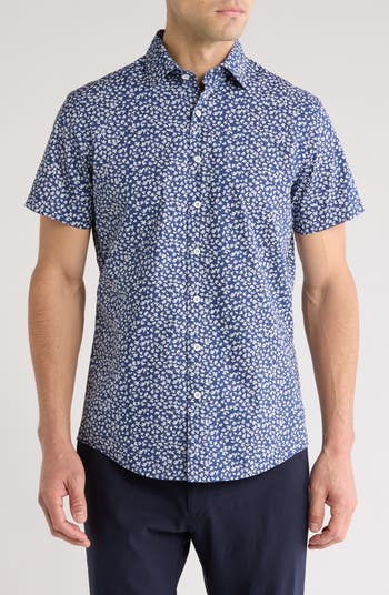 A ditsy floral print brings contemporary appeal to a trim-fit short-sleeve shirt constructed from breathable cotton for maximum comfort.