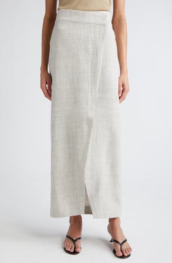 Add a polished element to any ensemble with this columnar maxi skirt in an asymmetric silhouette cut from slubbed, linen-enriched fabric.