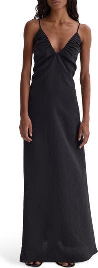 Cut from a luxurious, textured silk blend, this simple yet glamorous maxi features a skin-baring back and neckline pleats accenting the deeply dipped neckline.