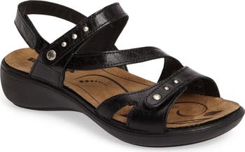 Polished studs add a bit of finesse to a strappy wedge sandal with a cushioned, arch-supporting footbed for superior comfort.
