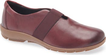 An everyday walking flat shaped from rich leather is styled with an elastic strap atop the toe and is grounded by a sturdy rubber sole.