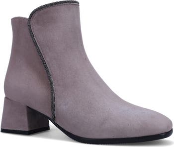 Beaded trim highlights the sleek lines of a water-resistant suede bootie set on a flared block heel and enhanced with comfortable cushioning.