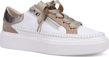 A PORON®-cushioned footbed provides optimal comfort and shock absorption in a luxe leather sneaker finished with winning little details—satiny laces, contrast accents and tonal whipstitching.