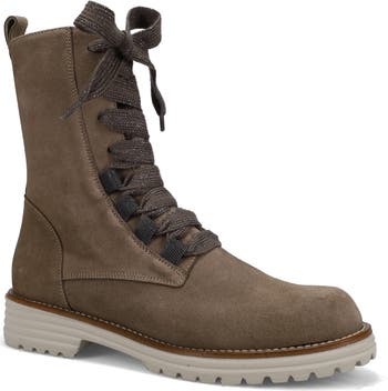 Toothy lugs and an anti-slip rubber sole ground this lace-up boot rendered in buttery suede and furnished with a side zipper for easy entry.