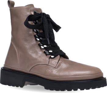 Chunky chain links secure the sparkly laces of this weatherproof-leather combat boot featuring All Day Heels® technology with a PORON-cushioned footbed.