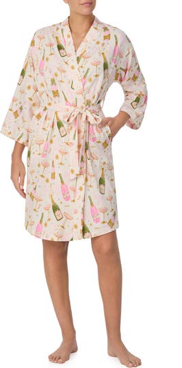 Pop bubbly and lounge the night away in this three-quarter-sleeve robe covered in a cute champagne pattern.