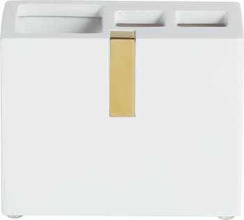 A polished metal inset brings an industrial appeal to a resin toothbrush holder that helps keep your bathroom neat and looks elegant on your counter top.