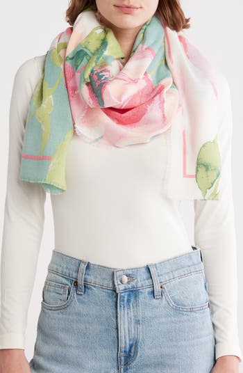 Watercolor flowers brighten a supersoft square scarf that brings a romantic touch to any outfit.
