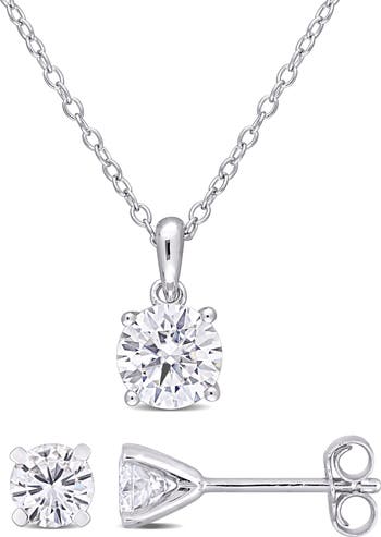 Show off elegant sparkle with this sterling silver pendant necklace and stud earrings set illuminated by round lab-grown moissanite stones.