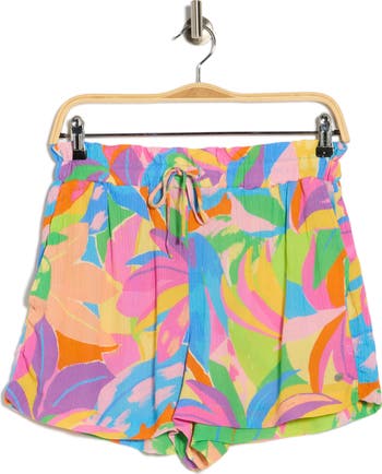 Unwind by the water or wander the shoreline in these paperbag-waist cover-up shorts detailed in a vibrant front pattern.