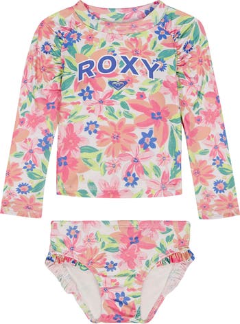 Your kiddo can enjoy the surf and sand in this protective set featuring a floral long-sleeve rashguaed and matching bikini bottoms.