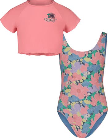 Your beach-loving kiddo will love the cover-up T-shirt in this summery set complete with a one-piece swimsuit patterned in pretty blooms.