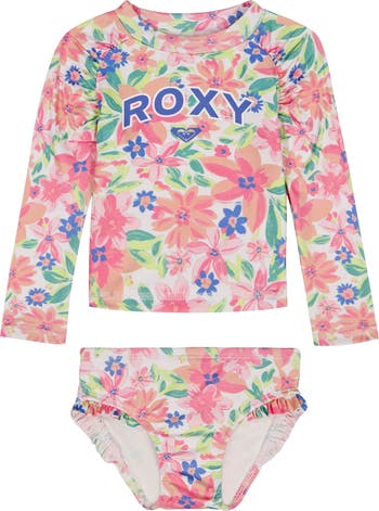 Ruched sleeves and ruffles add a little extra frill to this two-piece rashguard swimsuit made just for baby.