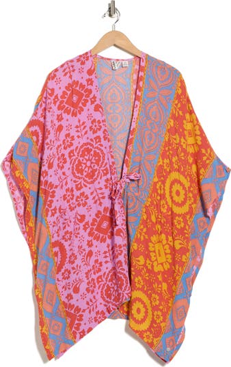 Unwind by the water or wander the shoreline in this chic cover-up topper featuring a vibrant floral pattern.