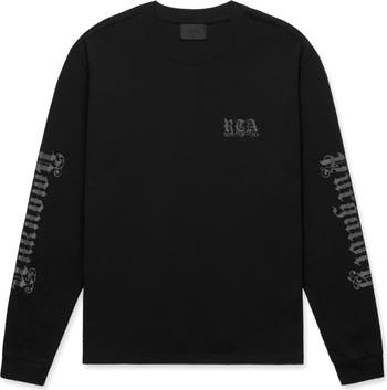 Step out of the shadows in a classic black long-sleeve T-shirt marked with Gothic-inspired typography prints on the chest and sleeves.