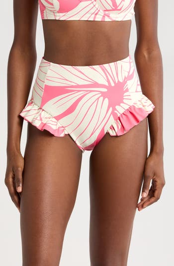 A high-waisted design appears to elongate the legs in these frilly swim bottoms with full back coverage to keep you comfortable.