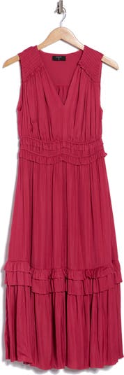 Dainty ruffles enhance the charm of this sleeveless midi dress fashioned with smocked shoulders, a shirred elastic waist and whimsically tiered silhouette.
