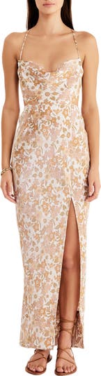 A curve-skimming slipdress is powered with flowers and styled with a strappy, open back.