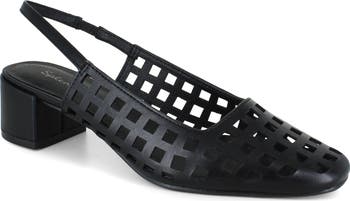Geometric cutouts give a light and airy feel to each stride in a sophisticated faux-leather pump secured by a slingback strap.