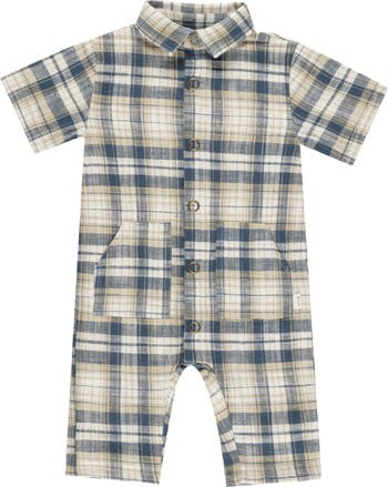 Plaid checks lend a sophisticated touch to a short-sleeve romper made from pure cotton that's breathable and gentle against their skin.