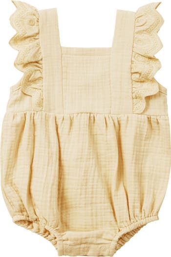 Perky embroidered-eyelet ruffles frame a bubble romper made from supersoft organic-cotton gauze and perfect for sunny days.