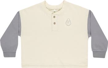 A relaxed fit enhances the comfort of a crewneck T-shirt made from breathable cotton and framed by long sleeves for comfort on chilly-day outings.