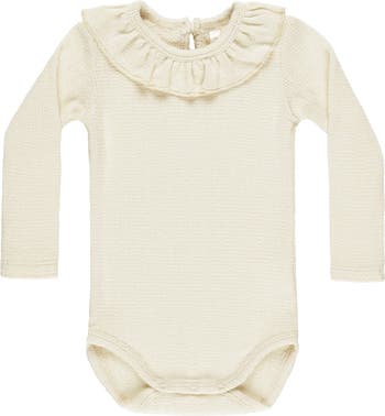 A rich texture and frilly ruffled collar distinguish a long-sleeve bodysuit that has baby looking sweet and stylish no matter the occasion.