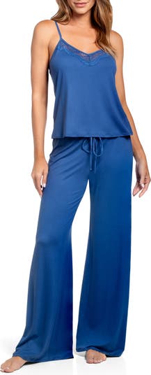 Drift off into dreamland in these soft pajamas featuring lace-trimmed V-neck camisole and wide-leg pants for effortless comfort.