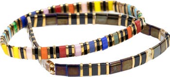 Shiny goldtone spacer beads pair with vibrant rectangular beads in this stackable set of stretch bracelets to add a playful pop of color to any look.