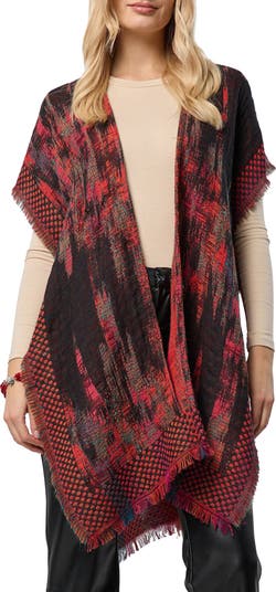 Flowy and free-spirited, this Bohemian-inspired poncho features an abstract pattern and fringe trim.