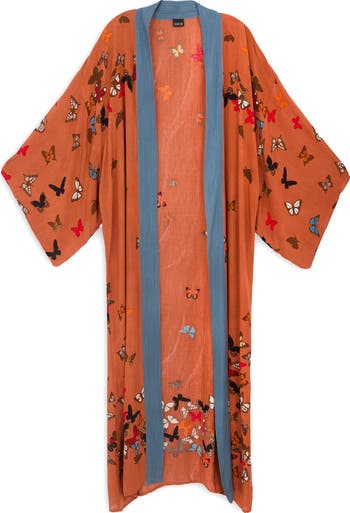 Flowy and free-spirited, this longline duster is crafted from butterfly-patterned fabric that exudes Bohemian charm.