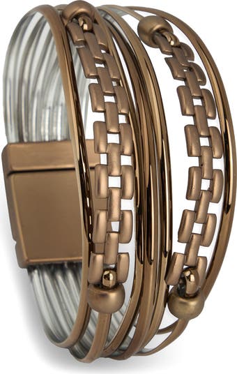 Textural chains and metallic cords bring striking shine to this layered bracelet secured by a gleaming magnetic clasp.
