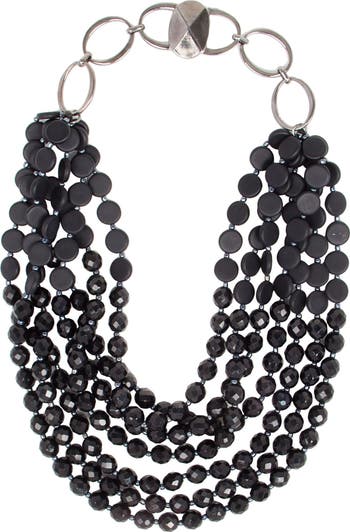 Offering an easy, stylish layered look, this silvertone plated necklace features rows and rows of glass beads.